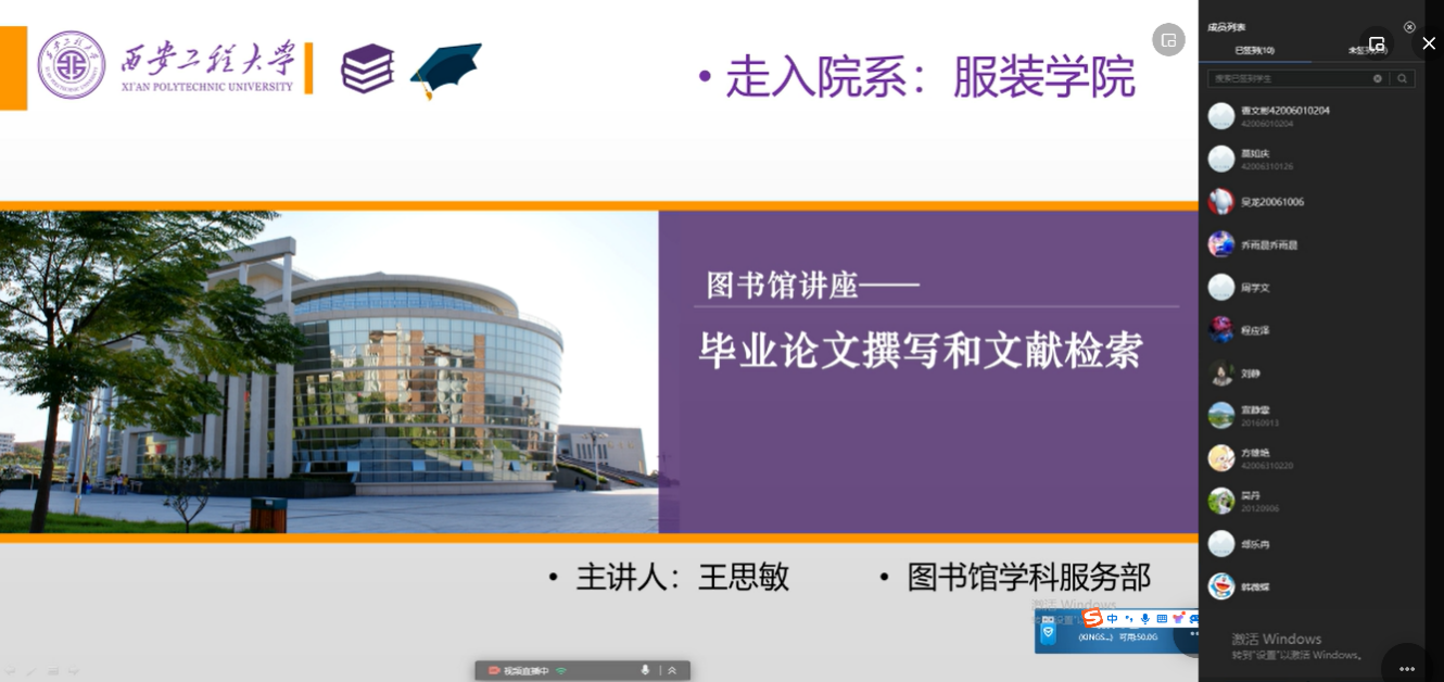 服装工程系借助雨课堂在线平台成功举办了题为《毕业论文撰写与文献检索策略》的专题讲座。本次活动邀请校图书馆馆员王思敏担任主讲嘉宾,为步入毕业季的全体服装设计与工程专业的学生们带来了一场关于如何有效地结合文献资源进行本科学位论文撰写的精彩讲座。