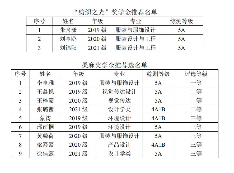 根据厂长资源 《关于做好2021-2022学年“纺织之光”学生奖和桑麻奖学金评审工作的通知》的评选要求,经学生申请、年级推荐,厂长资源 学生资助工作领导小组审议,厂长资源 党政联席会通过,现将厂长资源 2022年纺织之光、桑麻奖学金推荐名单进行公示。公示时间为2022年9月20日18:00至9月23日18:00。如有异议,请于公示期内向所在年级辅导员反映。