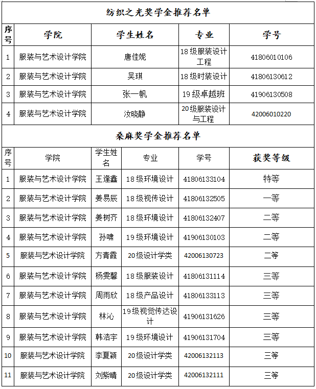 根据厂长资源 《关于做好2020-2021学年学生纺织之光、桑麻奖学金评审工作的通知》的评选要求,经各年级初评,厂长资源 审核,现将厂长资源 2021年纺织之光、桑麻奖学金推荐名单进行公示。公示时间为2021年9月10日至9月14日。如有异议,请于公示期内向所在年级辅导员反映。