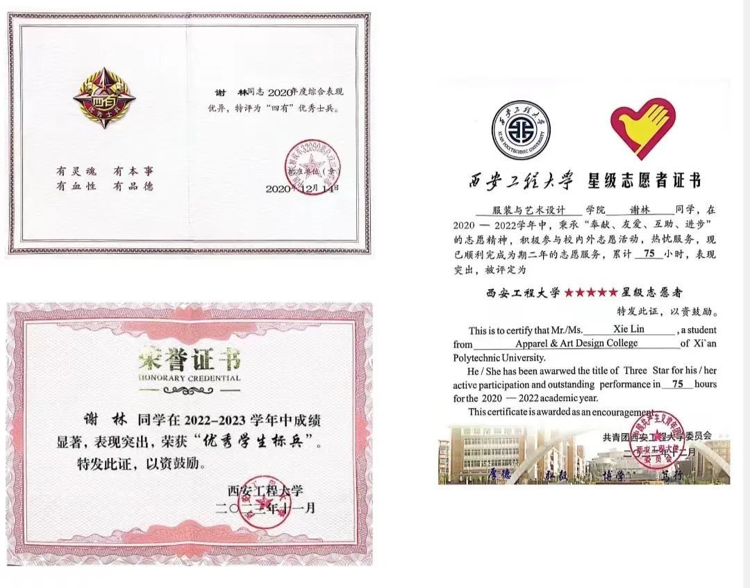 一等奖学金数次,同时获得校级优秀学生标兵、优秀学生、优秀团干部、五星级志愿者等荣誉称号,并在2019年申请实用新型专利一项。在校期间参加过诸多比赛,获蓝桥杯第13届国赛优秀奖、第14届省赛三等奖;第11届未来设计师全国高校数字艺术设计大赛陕西赛区一等奖、三等奖;2023赛季东方设计奖国赛三等奖等奖项。在参军期间,获32090部队“四有”优秀士兵及嘉奖。
