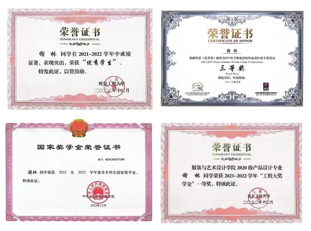 以赛促学也是我能够获得优异成绩的不二法宝。令我印象最为深刻的是,在万斯家居纺织品设计夏令营活动中,我发现自己的设计作品与其他高校同学的作品相比,存在较大差距。但我没有被打败,而是积极寻找提升自己的机会。整个夏令营期间,我忙碌且充实,白天安排满满的课程进行学习,晚上回到酒店后改进自己的设计,每天的标配是特浓咖啡和茶叶。在回忆起这段经历时,我感觉自己好像重新回到了孤身一人参加艺考的时候,但我通过自己的努力和毅力战胜了困难,收获了成功。那段时间我不断充实自己的生活,去尝试各种事情。渐渐地,我找到了自己的人生方向。在未来的学习生活中,我将继续瞄准目标,提升自我,用拼搏奋斗谱写自己崭新的人生篇章。