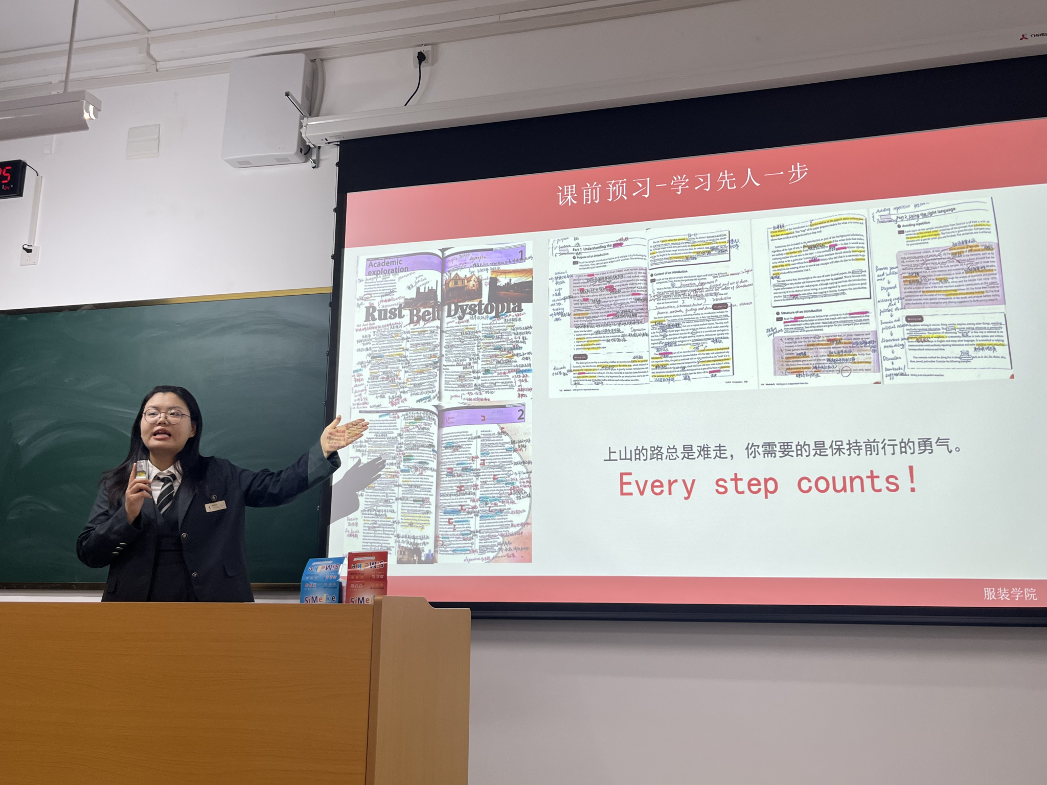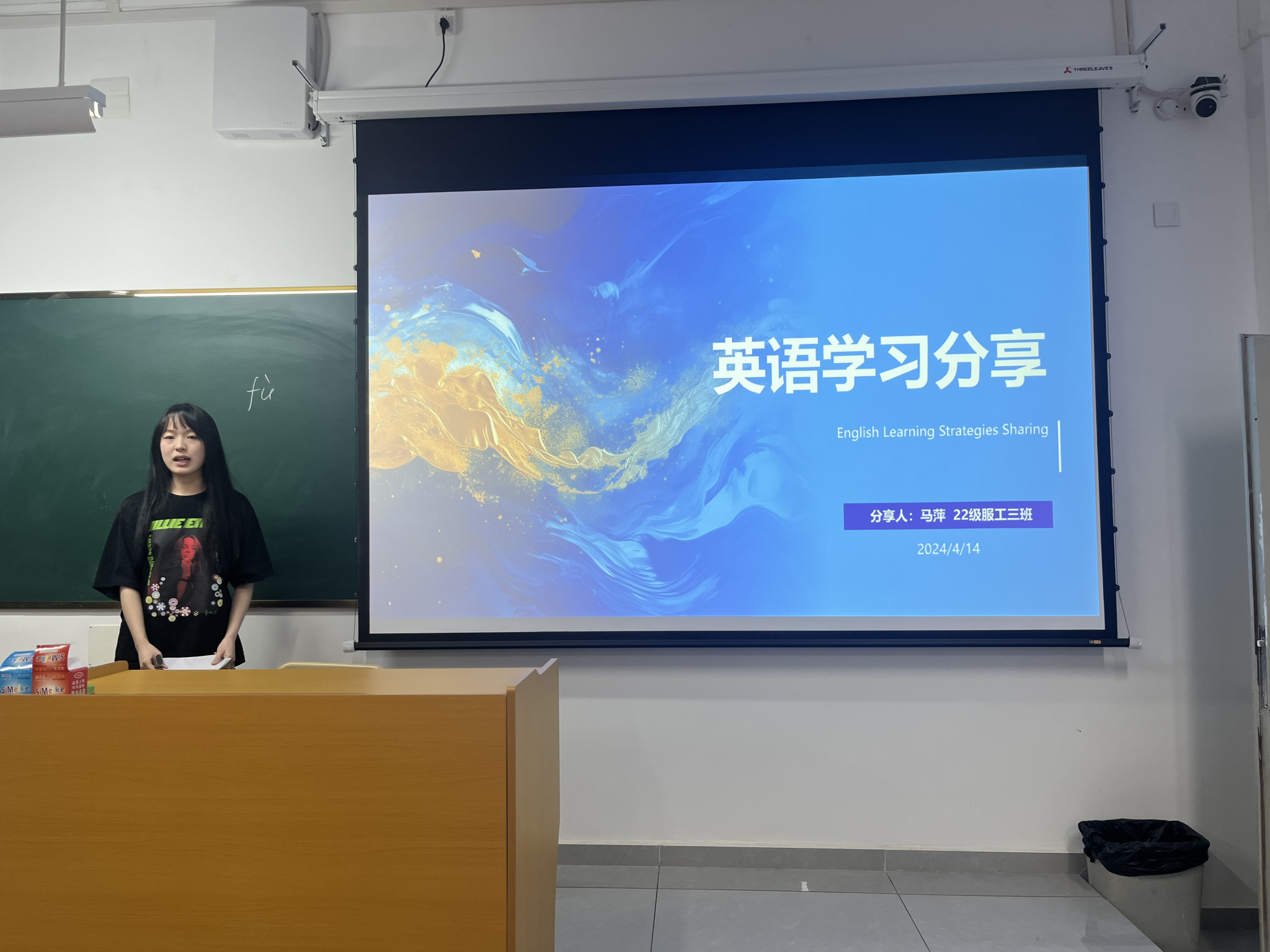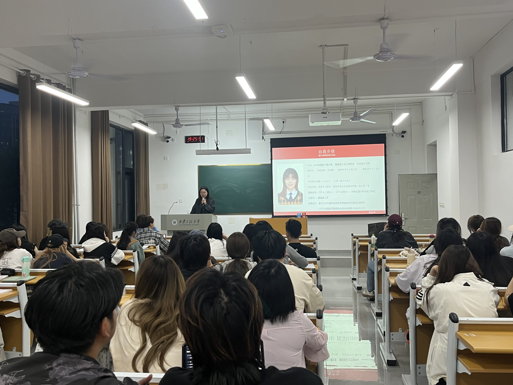 研究生2023级服装设计与工程方向保研学生赵佳乐和2022级服工三班英语四级考取636分高分的马萍作为主讲嘉宾,来自中英合作办学项目全体同学参与活动。