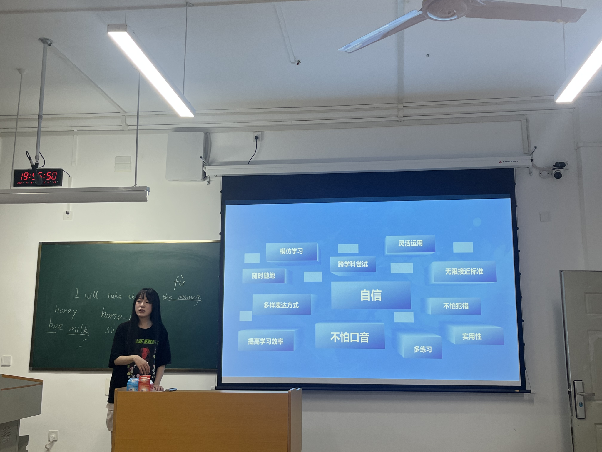 赵佳乐从课程英语学习、应试英语学习以及日常英语学习三个部分着手,分享了自己在专业英语学习,四六级、雅思、托福等应试备考的经验,并向大家科普了每年各类英语竞赛报名的时间,鼓励大家明确自己的目标,巧用身边的学习资源,有规划的学习。马萍从学习兴趣入手,向大家提供了具体的语法及单词记忆学习的思路,鼓励大家树立学习信心,大胆自信表达,多与外界用英语沟通。