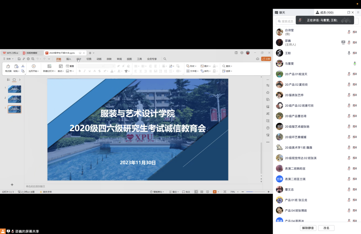 2020级召开研究生考试、四六级考试诚信教育会暨学风建设系列活动之一,2020级全体辅导员,全体考研学生及各班班委参加此次会议。