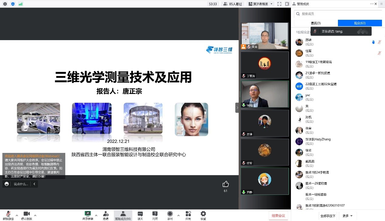 服装工程系于腾讯线上会议召开主题为《三维光学测量技术及应用》的服装工程系三全育人导师团专题讲座。此次讲座邀请渭南领智三维科技有限公司总经理唐正宗主讲,讲座由服装工程系副主任吴龙老师主持,服装工程系师生线上参加会议。