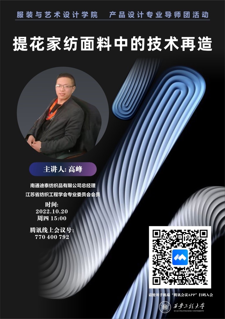 产品设计系于10月20号15:00在腾讯会议召开产品设计专业导师团活动。此活动特邀我校优秀校友、江苏省纺织工程学会专业委员会会员、南通市创新人才、南通迪泰纺织品有限公司总经理高峰工程师为产品设计专业全体师生进行《提花家纺面料中的技术再造》的主旨讲座,会议由产品设计系肖红老师主持,产品设计系教师及本科生300余人参加会议。