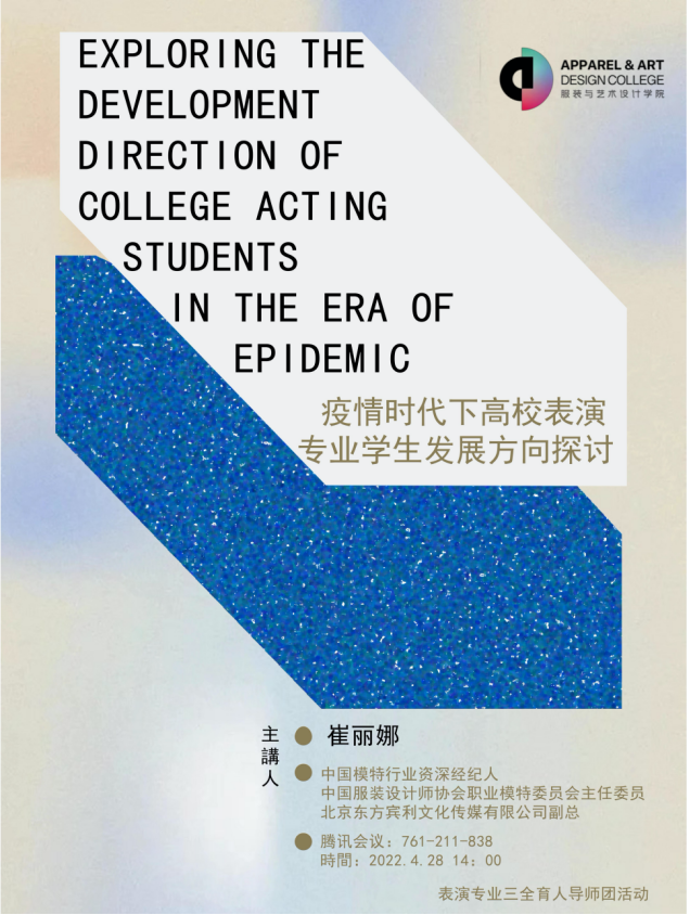 2022年4月28日下午14点,《疫情时代下高校表演专业发展方向探讨》线上直播讲座在服装楼一楼表演厅顺利召开。依照我校疫情防控常态化要求,本次讲座采用线上线下结合的模式。本次讲座有幸邀请了资深模特经纪人——崔丽娜,表演专业带头人张原老师、表演系讲师朱颖出席本次讲座。讲座由表演系副主任王勃老师主持,参与本次讲座的有2020级、2021级学生共70余人。本次讲座开始前,到会的70余名同学进行了分组线上面试,崔丽娜老师同时对一些学生进行了专业方面的问询和了解。