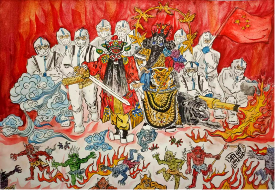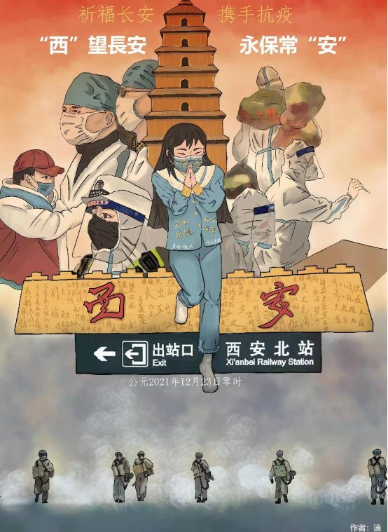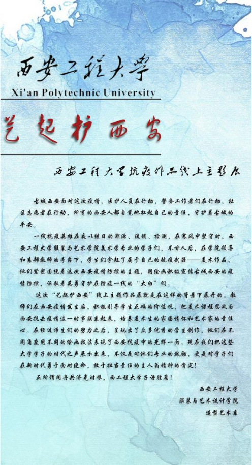 这次“艺起护西安”线上主题作品展就是在这样的背景下展开的,造型艺术系的教师们在院党委的号召下,在西安疫情发生后,积极引导学生正确的价值观,把美术课程思政与西安抗击疫情这一时事联系起来,培养美术生的家国情怀和艺术家的责任心。在经过师生们的努力之后,呈现出了众多优秀的学生创作,他们在不同角度用不同的绘画技法表现了西安抗疫中的光辉一面。现在我们把这些大学学子的时代之声展示出来,不仅是对他们专业的鼓励,更是对学子们在新时代勇于面对使命,敢于担当责任的主人翁精神的肯定!