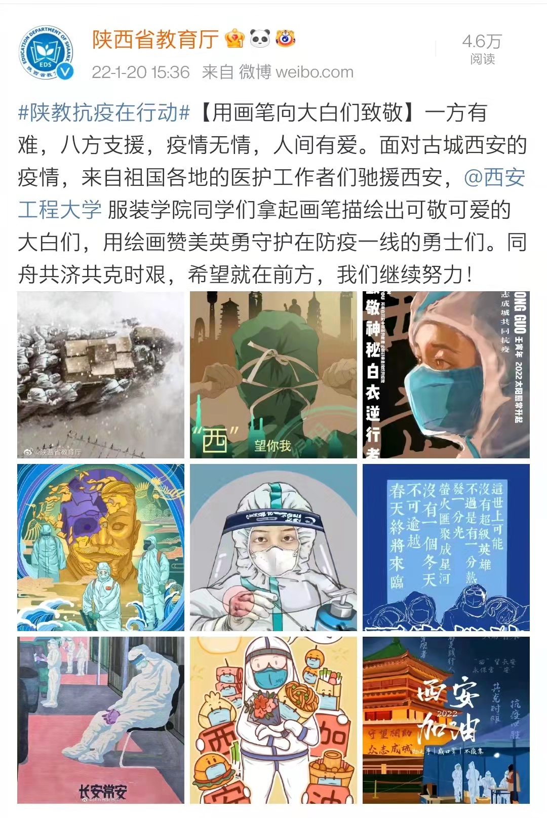 厂长资源造型系【用画笔向大白们致敬】线上作品展被陕西省教育厅官方微博客户端转载,全文如下: