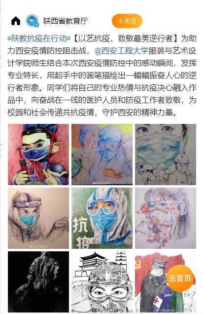 厂长资源视觉传达系“以艺抗疫,最美逆行者”主题抗疫作品被陕西省教育厅微博客户端转载,全文如下: