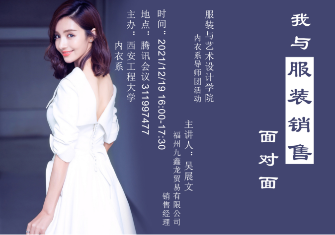 内衣工程系于12月19日在腾讯会议召开内衣工程专业报告会《聊聊服装销售那些事儿》。此次会议特邀我校优秀毕业生福州九鑫龙贸易有限公司销售经理吴展文主讲,会议由内衣系主任周捷教授主持,内衣系教师及全体本科生一百余人参加会议。