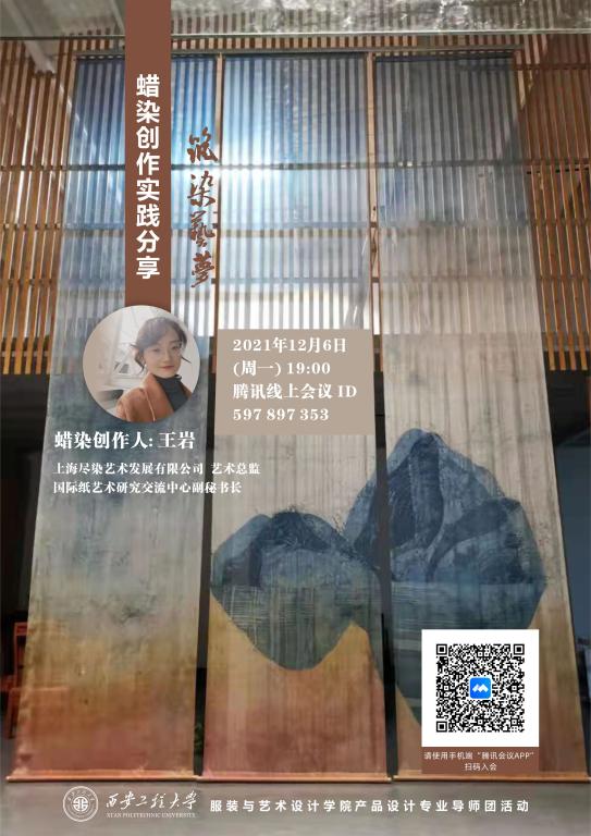 此次分享会王老师以自己的蜡染创作历程为例,探讨如何解决技术难题,将理论与实践相结合,创造市场上独有的新型蜡染艺术。以具体的案例分析为主,讲解如何将多种材质、染料和工艺技法综合运用于蜡染艺术的创作之中,从较高层面对蜡染艺术进行广泛且深入的研究,研究出蜡染艺术的瓷韵之美,蜡染艺术的侘寂之美,形成独特的蜡染水彩风格,以打破蜡染以往的蓝白调。内容丰富、深入浅出,从具体的实践分享角度让给师生获益匪浅。