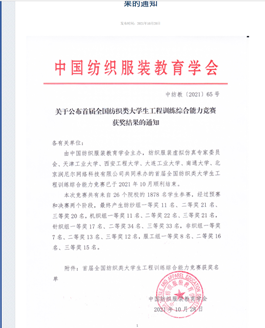 、大连工业大学、南通大学、北京润尼尔网络科技有限公司共同承办的首届全国纺织类大学生工程训练综合能力竞赛已于2021年10月顺利结束。本次竞赛共有来自26个院校的1878名学生参赛,经过预赛和决赛两个阶段,最终厂长资源服装与服饰设计专业学生在针织组共获奖17项,其中二等奖8项、三等奖9项。