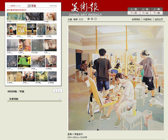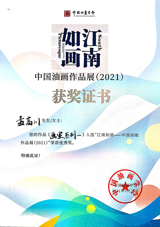 在“江南如画--中国油画作品展(2021)”活动中,孟嵩川的油画作品《画室系列一》获得优秀奖(银奖),并被苏州美术馆收藏。“江南如画--中国油画作品展(2021)”由中国油画学会主持的大型国家级展览。该展览每两年举办一次本届是第四届,本届组委会共收到5400余件投稿作品,经过专家评委的数轮投票层层筛选从364件入围复评的作品中甄选出180件作品入展,并从中评选出10件颜文樑艺术奖(金奖)、20件颜文樑优秀奖(银奖)被苏州美术馆收藏。