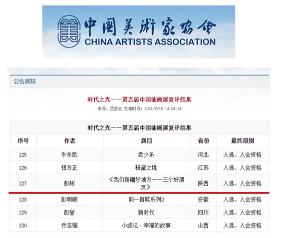 我校教师彭彬油画作品《我们新疆好地方-三个朋友》入选“时代之光——第五届中国油画展”并被评为入会资格作品,在重庆美术馆展出。“中国油画展”作为中国油画领域有着重要影响的美术盛会,推出了大量美术人才和美术精品,为中国美术事业繁荣发展做出了积极贡献。中国美术家协会油画艺委会自1985年成立以来,在中国油画发展的不同阶段已经成功举办了四届中国油画展,得到了油画学术界和广大观众的认可。