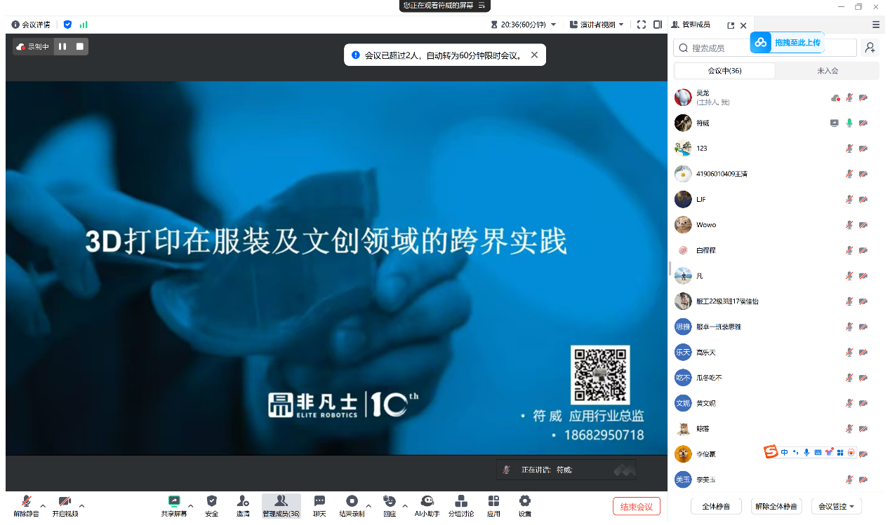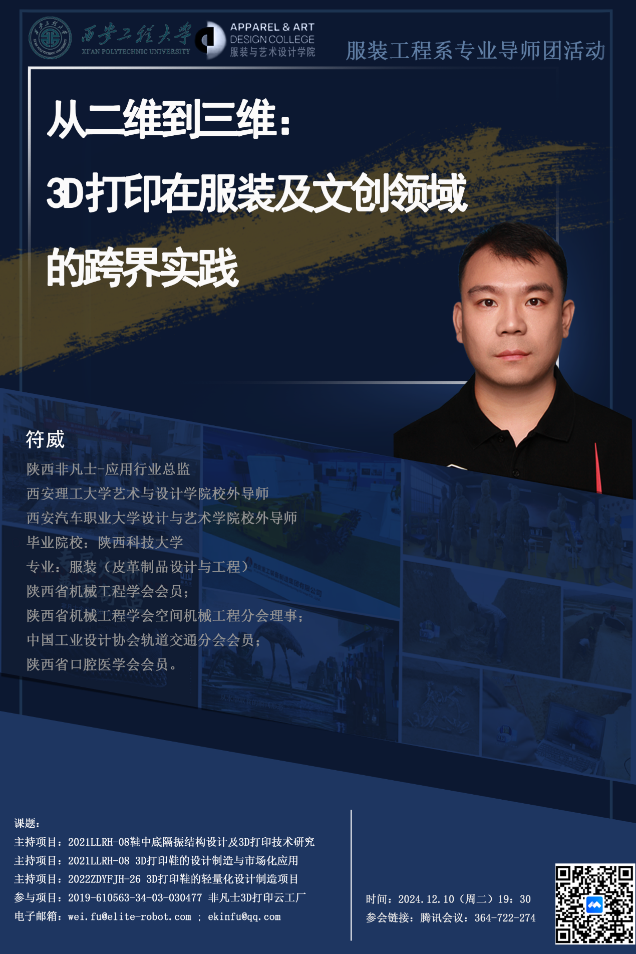 服装工程系于12月10号周二晚19:30在腾讯线上会议召开主题为《3D打印在服装及文创领域的跨界实践》的服装工程系专业导师团活动讲座。此次讲座邀请陕西非凡士三维科技有限公司应用总监符威主讲,由服装工程系副主任吴龙老师主持,服装工程系师生线上参加会议。