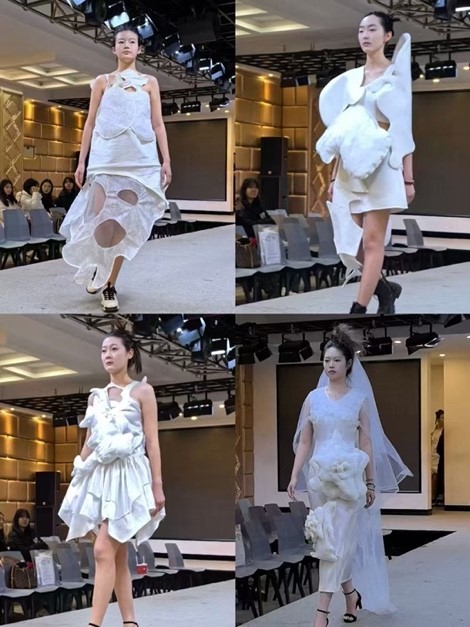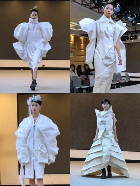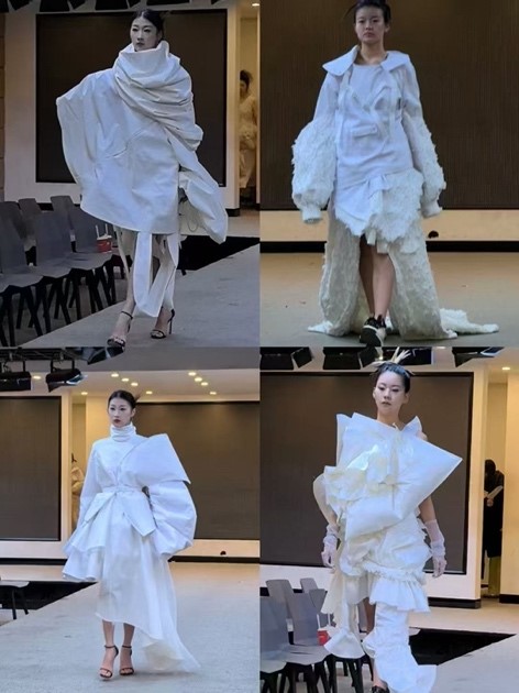 赵小鱼代表本门课程教师作开幕致辞。23级中英合作办学服装与服饰设计专业同学在服装设计调研拓展与实践课程中精心准备的59套设计作品依次亮相。这些作品造型各异、独具创新,充分展现了学生们对创造性立裁思维与平面剪裁知识的融合,以及在服装设计上廓形的创新与亮点。从二维效果图到细节款式图设计,再到经过纸胚,布胚和三次试衣后完成的成品,学生们历经层层打磨,实现了从设计到成衣完型的闭环训练,完成了设计思维的提升和制版工艺上质的飞跃。