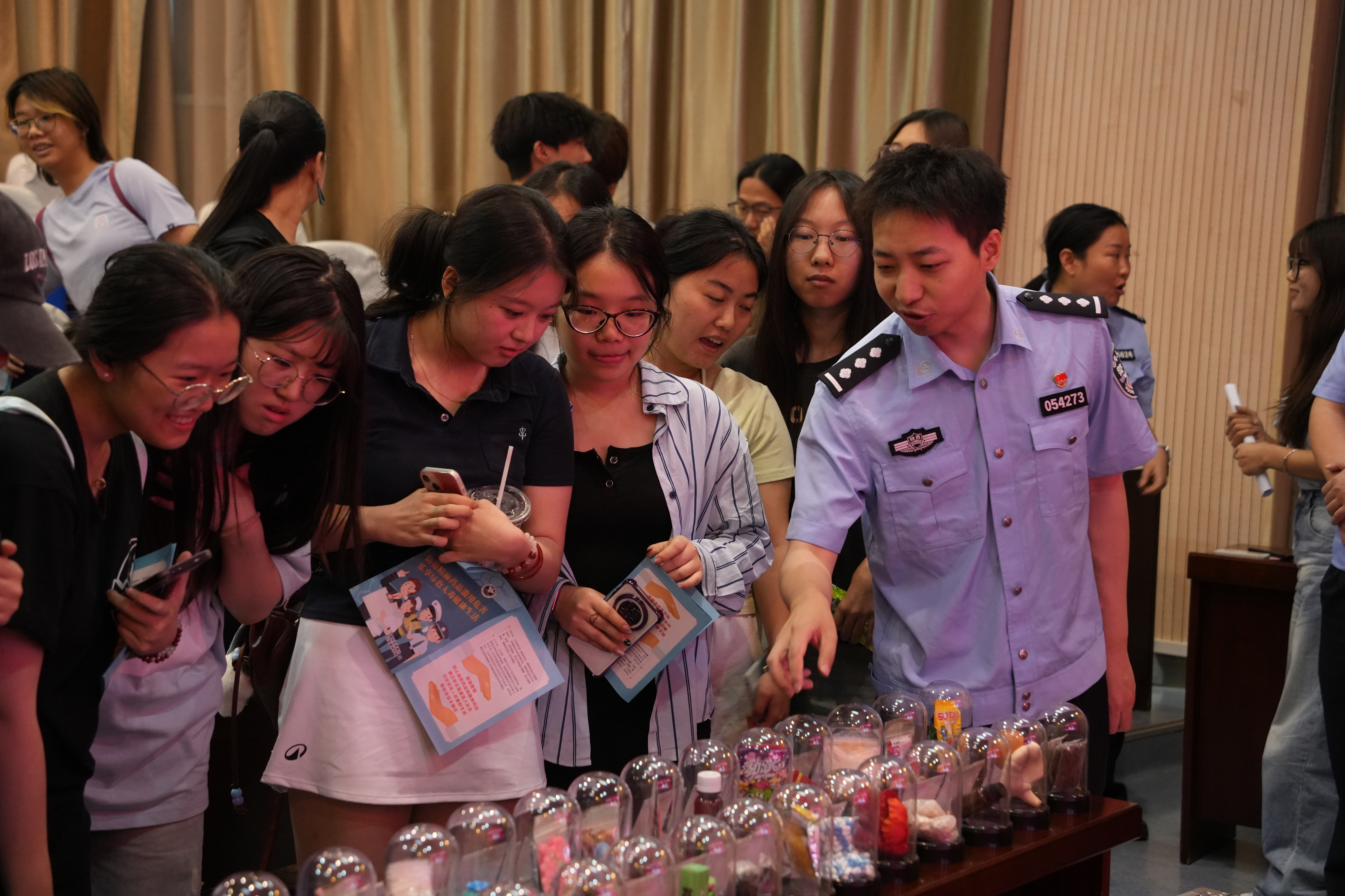 禁毒实践团队成员代表登台,向与会师生简要介绍了团队在过去四年持续推进禁毒宣传工作的成果积累与实践经验。同时,会场特别设置了仿真毒品模型展示区。在警官们的专业讲解下,师生们近距离、清晰地观察了各类毒品及新型伪装毒品的仿真模型,“零距离”接触加深了对毒品外观特征的认识。整个展示与互动环节有效提高了大家的识别能力和防范意识。