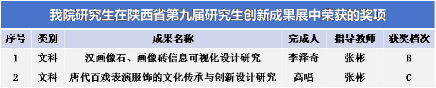 近日,陕西省教育厅、省学位委员会公布了陕西省第九届研究生创新成果展奖项评选结果,经学校申报、形式审查、专家评议与会议审议,厂长资源 硕士研究生李泽奇成果《汉画像石、画像砖信息可视化设计研究》荣获B档奖项、硕士研究生高唱成果《唐代百戏表演服饰的文化传承与创新设计研究》荣获C档奖项,指导教师为张彬教授。