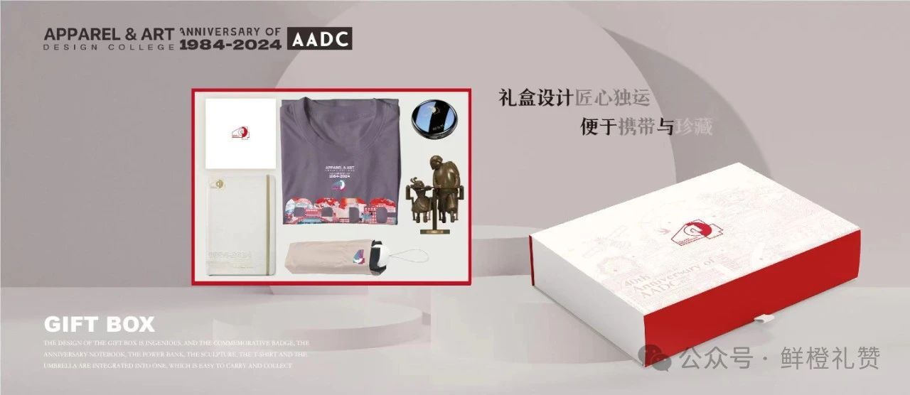 礼盒设计匠心独运,将纪念徽章、院庆纪念笔记本、充电宝、雕塑、T恤和雨伞集于一体,便于携带与珍藏。