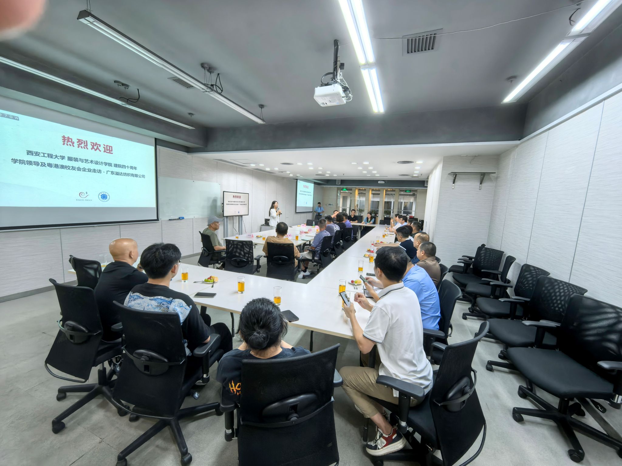 院庆之际重返母校,共襄盛举。我校校友,广东溢达纺织有限公司总经理黄坤宇代表粤港澳校友会及广东溢达纺织有限公司表达了对母校深深的眷恋与支持,介绍了广东溢达纺织有限公司产业转型后的发展情况。双方围绕纺织服装面临的机遇和挑战展开讨论,共同探索产业转型后的发展新契机。会后考察团一行参观了广东溢达纺织有限公司。