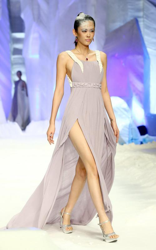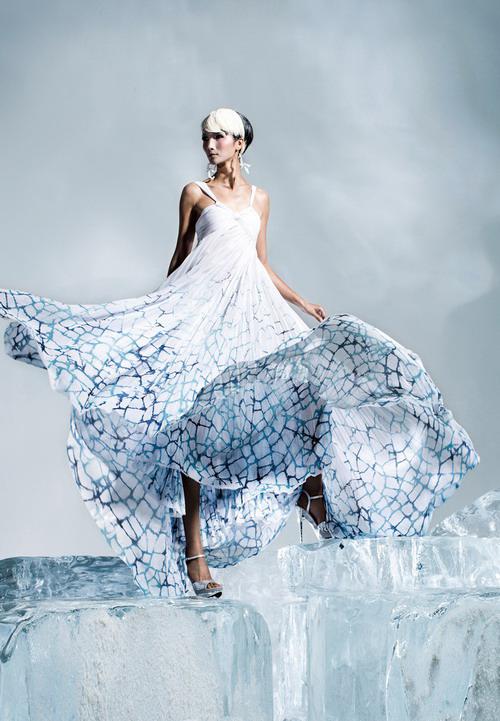 在这个世界中,优雅与性感则成了刘薇的灵性感悟,模特们超凡脱俗的气质使然,都由此找到了答案。刘薇对“冰”的表达不仅局限于色彩,而是有更不一样的处理方式,精妙的结合了东方文化与国际时尚的精髓,由中国传统陶瓷中逐渐失传的“冰裂纹”工艺带来的灵感,缔造出新的花纹设计,在追求经典线条的细致剪裁中,以及对各种不同质地面料的超强把握,勾勒出灵动飘逸的清澈感。