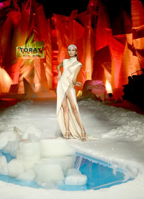 与冰川感觉十分融合的是刘薇大量使用了东丽集团开发的超高透气性、防皱性、点接触性兼具的全新节能环保面料——“冰淇纺beegette?”。正如名字一般源于炎炎夏日里冰淇淋及冰果露的灵感设计,带来全新清凉穿着体验,舒适的触感,如轻新之风扑面而来。